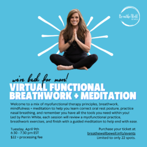 Led by Perrin White, each session will review a myofunctional practice, breathwork exercises, and finish with a guided meditation to help end with ease.